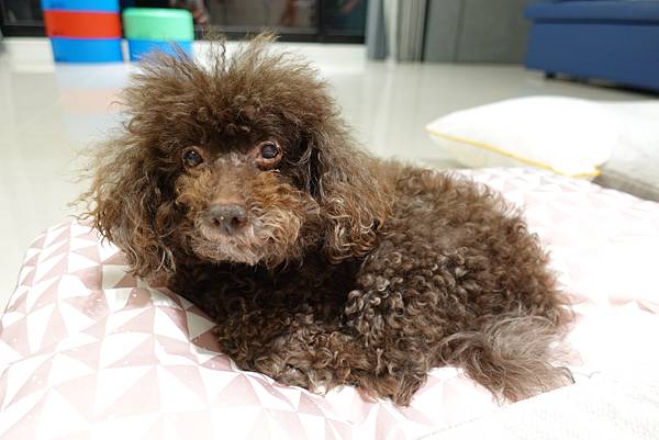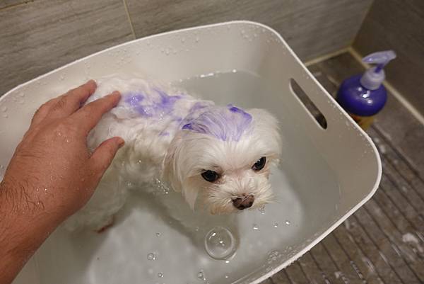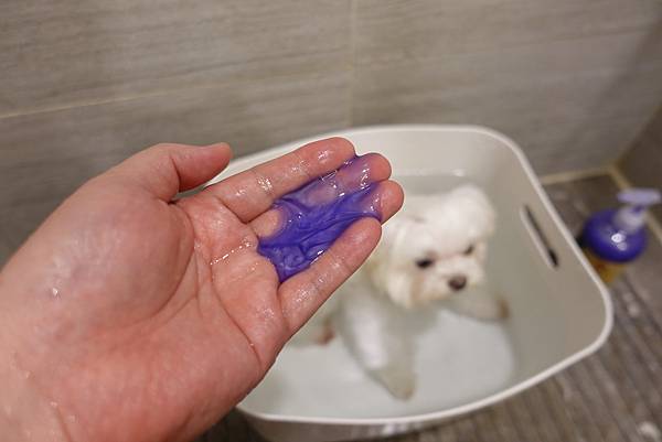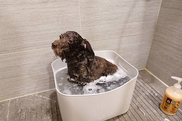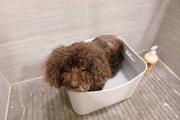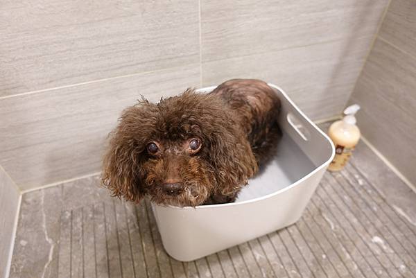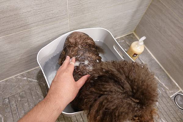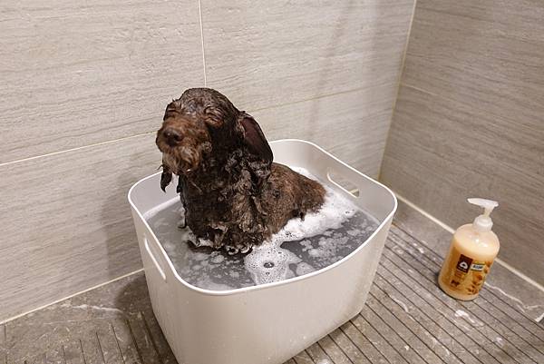 因為家中的貴賓狗年紀有點大了,所以要使用溫和不刺激的洗毛精,免得抓個不停~