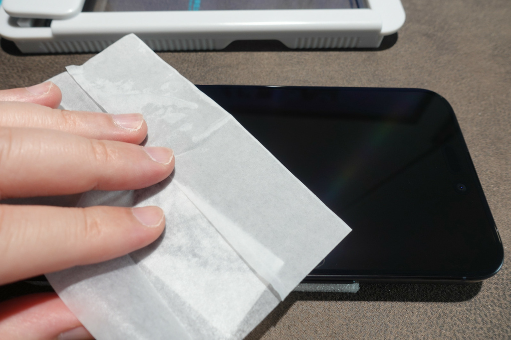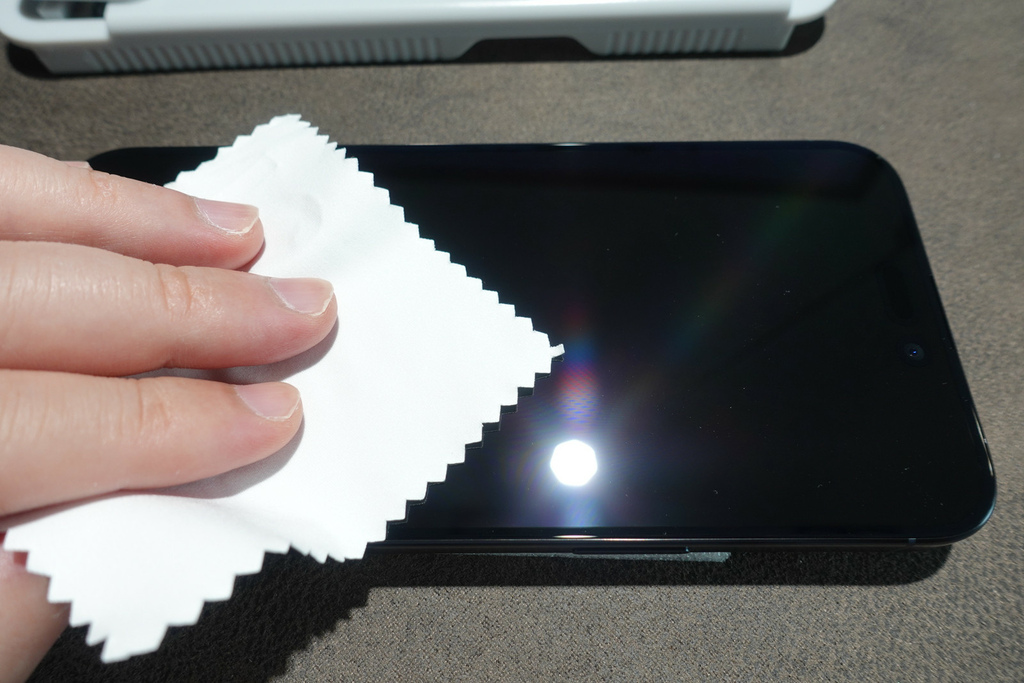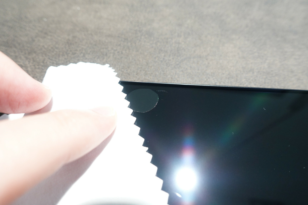 再用2號乾擦式布將螢幕擦拭乾淨,再用3號除塵貼紙沾黏掉螢幕表面灰塵~